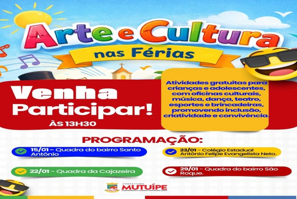 Com o objetivo de promover lazer, aprendizado e inclusão social durante o recesso escolar, a Prefeitura de Mutuípe, por meio da Secretaria Municipal de Cultura, Esporte e Turismo, deu início ao projeto “Arte e Cultura nas Férias”, voltado para crianças e adolescentes do município. A iniciativa busca ocupar o período das férias com atividades educativas e recreativas, estimulando o desenvolvimento cultural e social dos participantes.